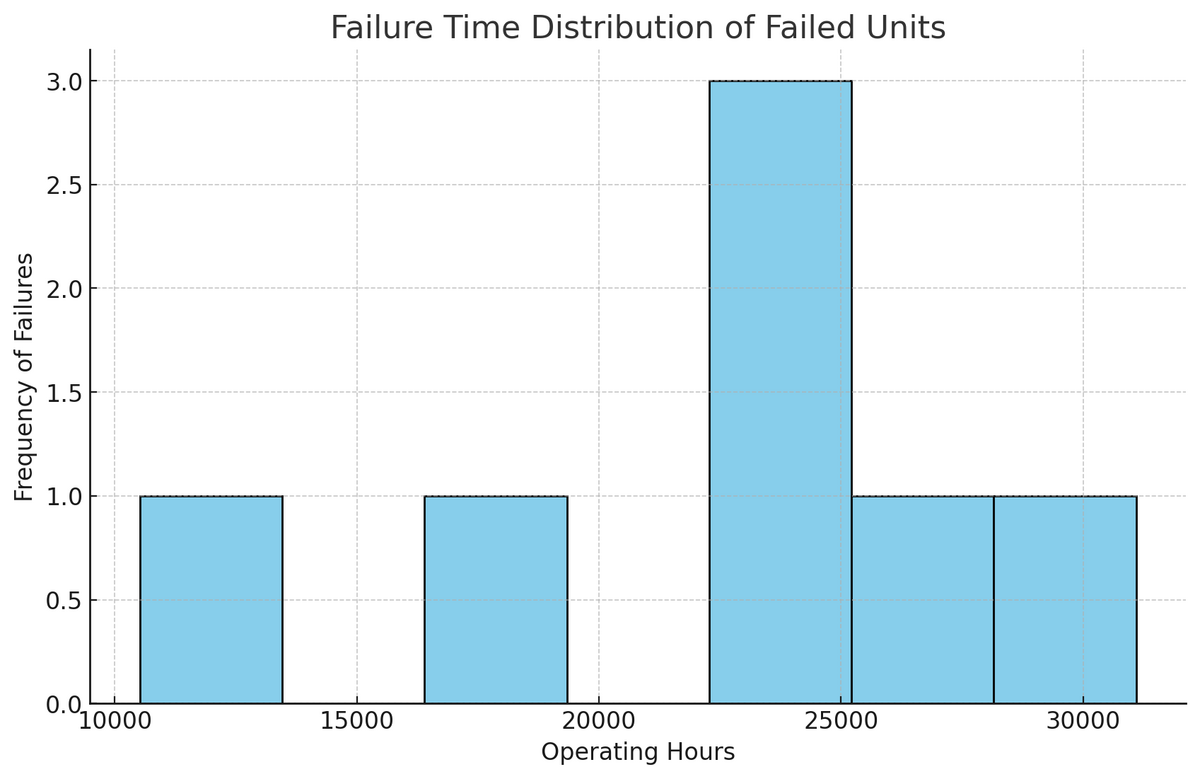 であり、下記故障時間のヒストグラムを見るに25000時間前後での故障率が高いことが伺える。